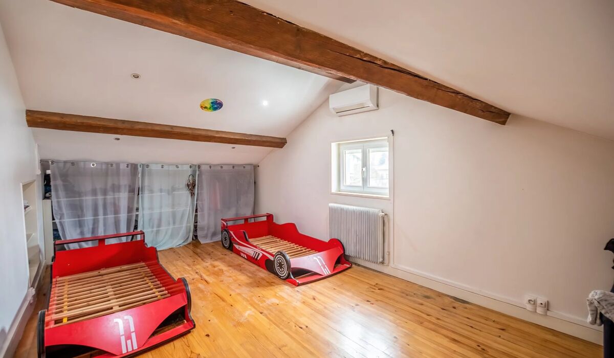 AU CŒUR DU VILLAGE DE THIL venez découvrir une maison de type T5 de 137 m² habitable + 82m² de surface aménagée sur TERRAIN CLOS de 326m². Composée au premier étage: d'une cuisine entièrement équipée de 17m² ouverte sur une magnifique pièce à vivre de 35 m² avec son poêle à bois, deux chambres, salle d'eau et WC.