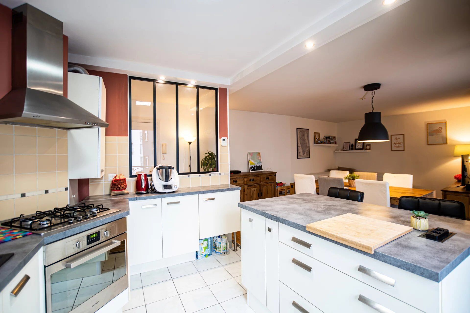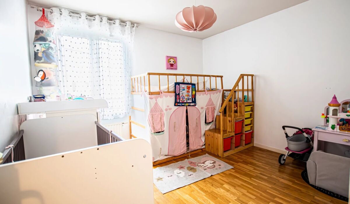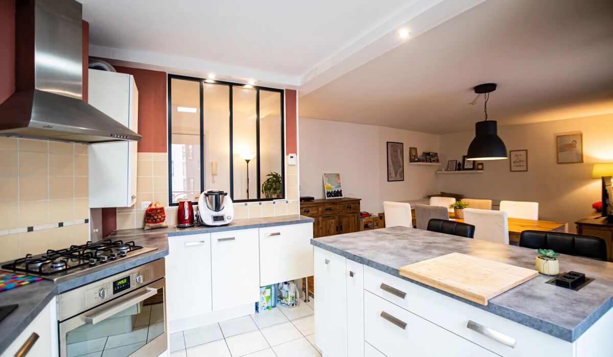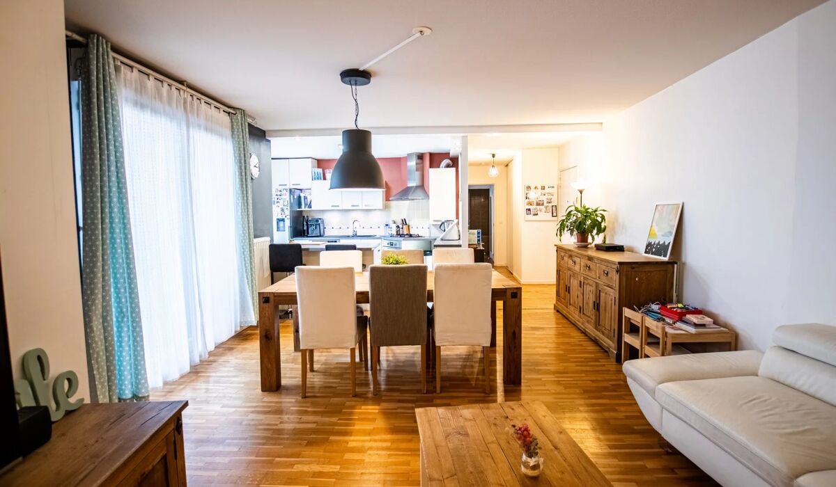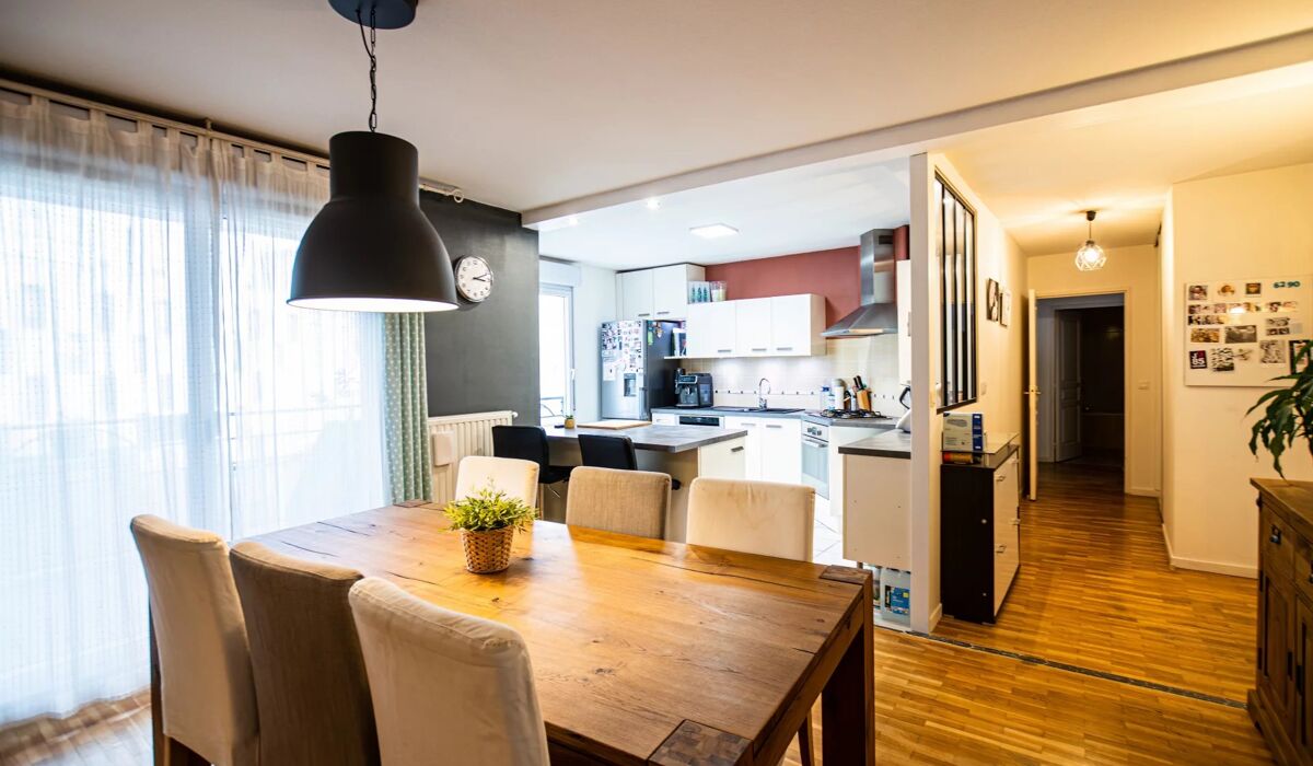 Ce bel appartement bénéficie d'un vaste séjour, d'une cuisine de type US ouverte sur la pièce de vie, d'un espace nuit séparé avec deux chambres, d'une salle de bain et d'un WC séparé.